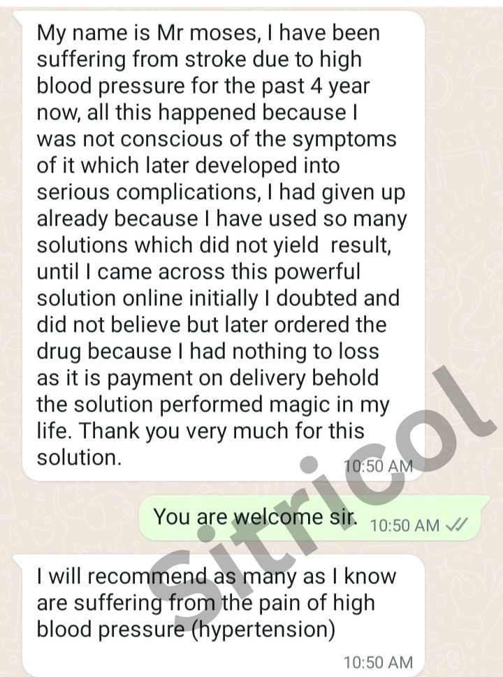 From the second day I started using sitricol, I have been very happy with the result I have been getting from this sitricol treatment. Now my systolic & diastolic readings had stabilized to around 115/76mm/hg. I wasn't having those side effects I used to have from my old drugs. All the symptoms are completely gone.